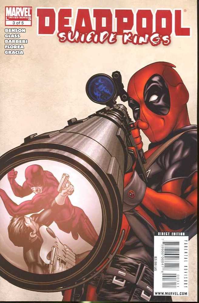 FIRST PRINTING. SUICIDE KINGS: PART 3 DEAD MAN'S HAND. Written by MIKE BENSON & ADAM GLASS. Art by CARLO BARBERI & SANDU FLOREA. Cover by MIKE MCKONE. Deadpool's been framed. No, really! This time, Wade didn't do it -- and he's determined to prove his innocence and find the person responsible. But first, he's got to stay alive or out of jail. And with the Punisher and Spider-Man both hot on his trail, that's not going to be easy. Even if he's got the help of a certain Man Without Fear.
