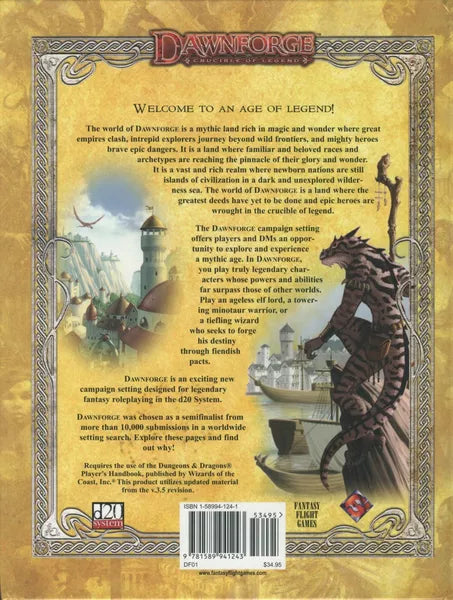 The world of Dawnforge is a mythic land rich in magic and wonder where great empires clash, intrepid explorers journey beyond wild frontiers, and mighty heroes brave epic dangers. It is a land where familiar and beloved races and archetypes are reaching the pinnacle of their glory and wonder. It is a vast and rich realm where newborn nations are still islands of civilization in a dark and unexplored wilderness sea. The world of Dawnforge is a land where the greatest deeds have yet to be done and epic heroes are wrought in the crucible of legend.