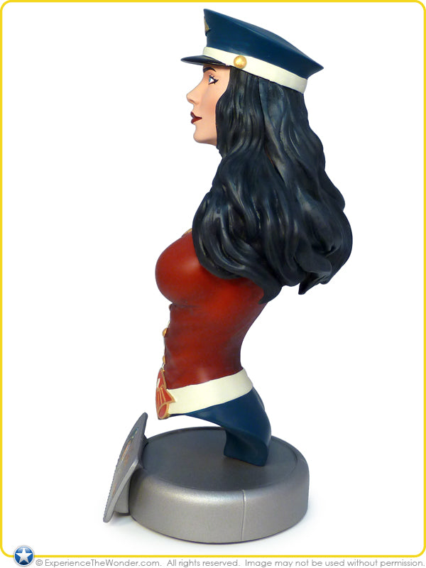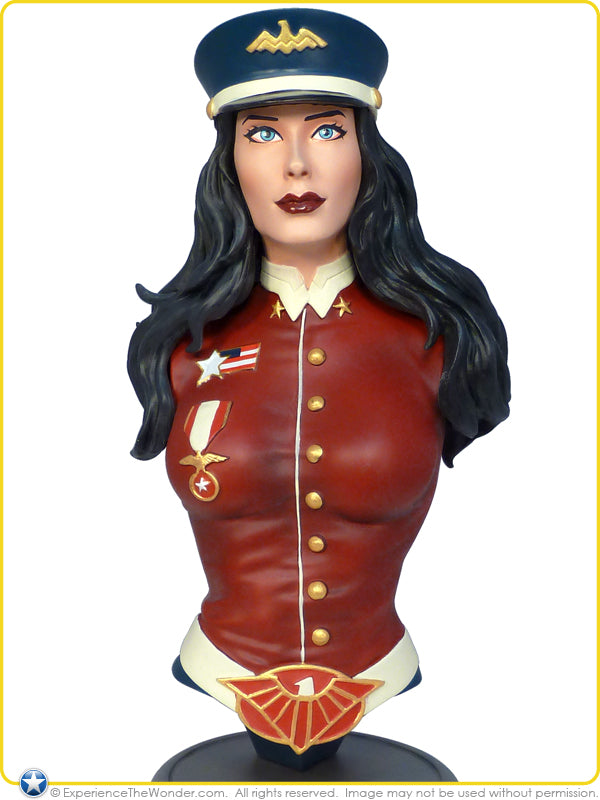 Hand-painted cold-cast porcelain statue of the DC Comics Bombshells Wonder Woman inspired by the variant cover artwork for Justice League, Vol. 2, Issue #43 (August 2015) by Emanuela Lupaccino with full-color eye decals on a base inspired by riveted steel that includes a magnetic nameplate decorated with a full-color decal.