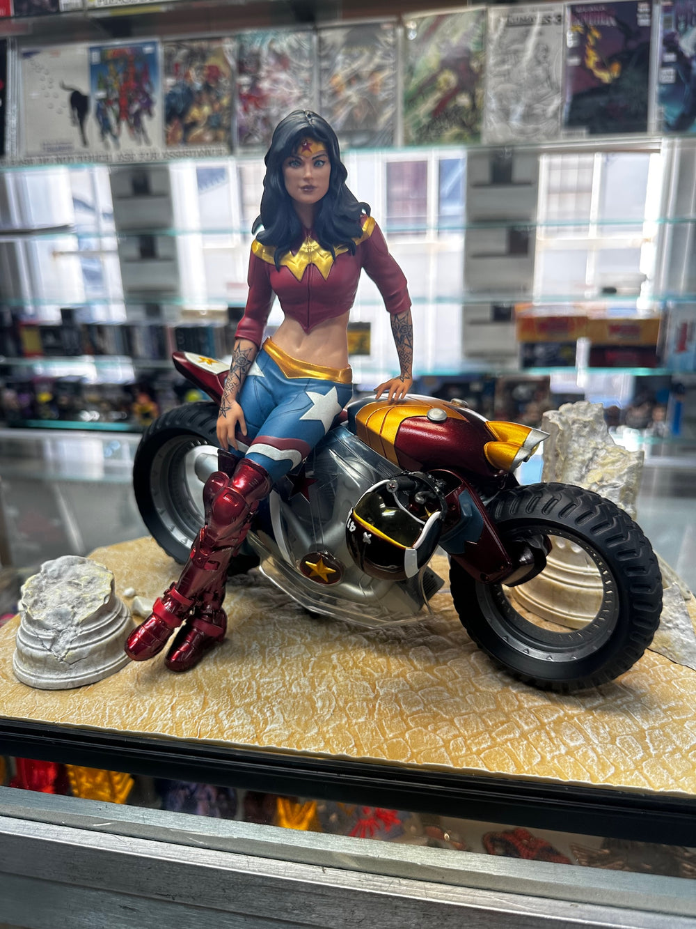 The Amazon Princess is on the move! Having traded in her invisible jet for a very visible motorcycle, Wonder Woman becomes a gritty, glamorous road warrior in this charming statue.