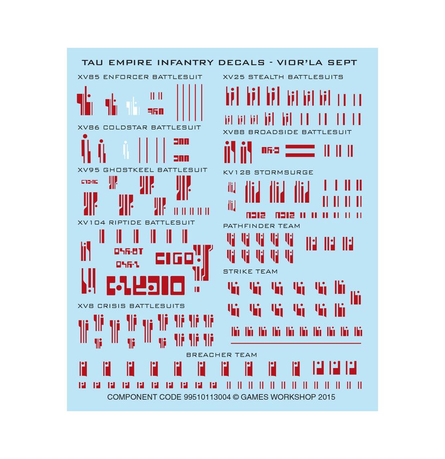 This kit is supplied with 1x T’au Empire Infantry Decals – Vior’la Sept Transfer Sheet, containing 177 high-quality waterslide transfers. These include symbols for Stealth Battlesuits and other T’au Empire units, including Pathfinder Teams, XV95 Ghostkeel Battlesuits, and more.