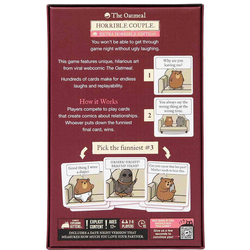 Horrible Couple is an unfiltered couples card game about love, laughs, and terrible decisions. Created by The Oatmeal and Exploding Kittens, it turns romance into ridiculous three-panel comics where the best (or worst) punchline wins. You can play cooperatively to test your connections or competitively to see who comes up with the funniest ending. With 2 - 8 players recommended you can invite other friends or couples to make their own horrible comics. Fast, easy, and endlessly replayable, Horrible Couple is the marquee comic strip like card game that can be enjoyed or gifted to anyone with a dark sense of humor.