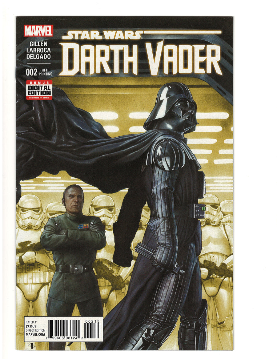 Fifth Printing - Written by Kieron Gillen. Art by Salvador Larroca. Cover by Adi Granov. The original Dark Lord of the Sith stars in his first ongoing series! Ever since Darth Vader made his first on-screen appearance, he became the one of the most popular villains to ever haunt an audience's dreams! Now, follow Vader straight from the ending of A NEW HOPE (and the pages of the new STAR WARS comic book) into his own series, showing the Empire's war with the Rebel Alliance from the other side! 28 pages, full color. Rated T Cover price $3.99.