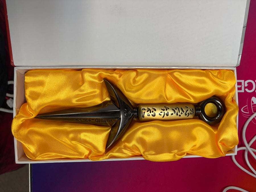 From the pages of Naruto comes a metal replica of Naruto's father, Minato, the 4th Hokage's Kunai! Over nine inches long and made of metal. There is light wear on box and light scuffs on blade.